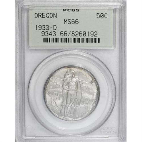 <B>1933-D 50C Oregon MS66 PCGS.</B></I> Soft, swirling luster is the primary asset of this beautifully preserved D-mint Oregon half. Delicate lavender and golden-tan tints visit otherwise cream-silver surfaces. PCGS has graded 62 finer examples (1/08).<BR><BR><b>Shipping:</b> Coins & Currency (<a target="_blank" href="http://www.heritageauctions.com/common/shipping.php">view shipping information</a>)