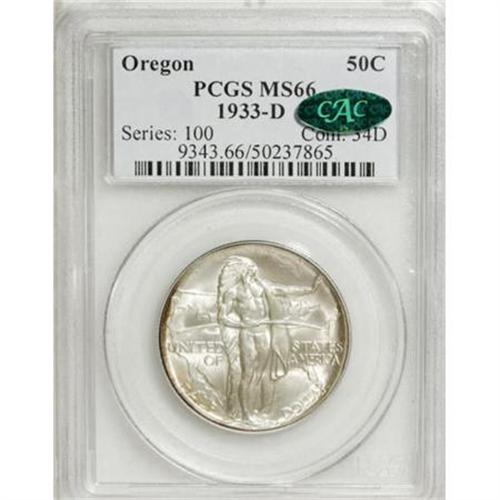 <B>1933-D 50C Oregon MS66 PCGS. CAC.</B></I> Orange color accents silver-gray lustrous surfaces that are devoid of significant marks. The design elements are suitably struck.<BR><I>From The Southwest Collection.</B></I><BR><BR><b>Shipping:</b> Coins & Currency (<a target="_blank" href="http://www.heritageauctions.com/common/shipping.php">view shipping information</a>)