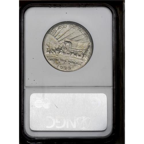 <B>1933-D<50C> Oregon MS67 NGC.</B></I> Dappled lemon-yellow, deeper gold, and dark brown toning can be seen over ivory surfaces. A pleasing example, with only two finer coins certified by NGC. Census: 19 in 67, 2 finer (2/06).