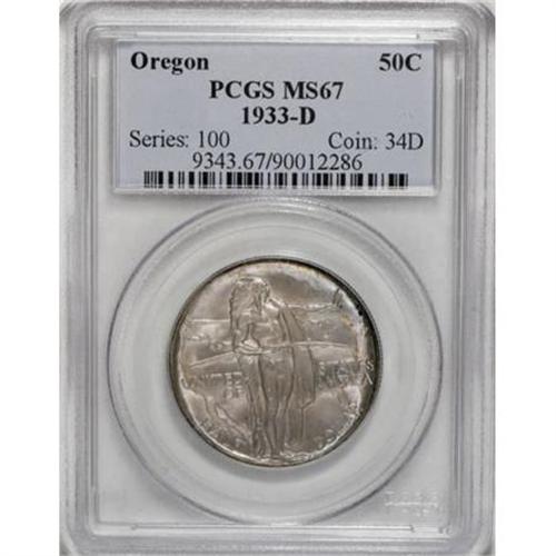 <B>1933-D 50C Oregon MS67 PCGS.</B></I> Satiny luster rolls across the original light golden-brown and pearl-gray surfaces. The trailblazing pioneer and the back of the Conestoga wagon are not fully struck, but the design elements are otherwise crisp. A splendid representative from the middle years of this long-lived commemorative type. Population: 62 in 67, 0 finer (8/07). <BR><BR><b>Shipping:</b> Coins & Currency (<a target="_blank" href="http://www.heritageauctions.com/common/shipping.php">view shipping information</a>)
