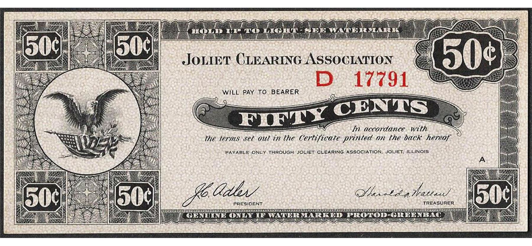 One 1933 Fifty Cents Joliet, Illinois Clearing Association Check.