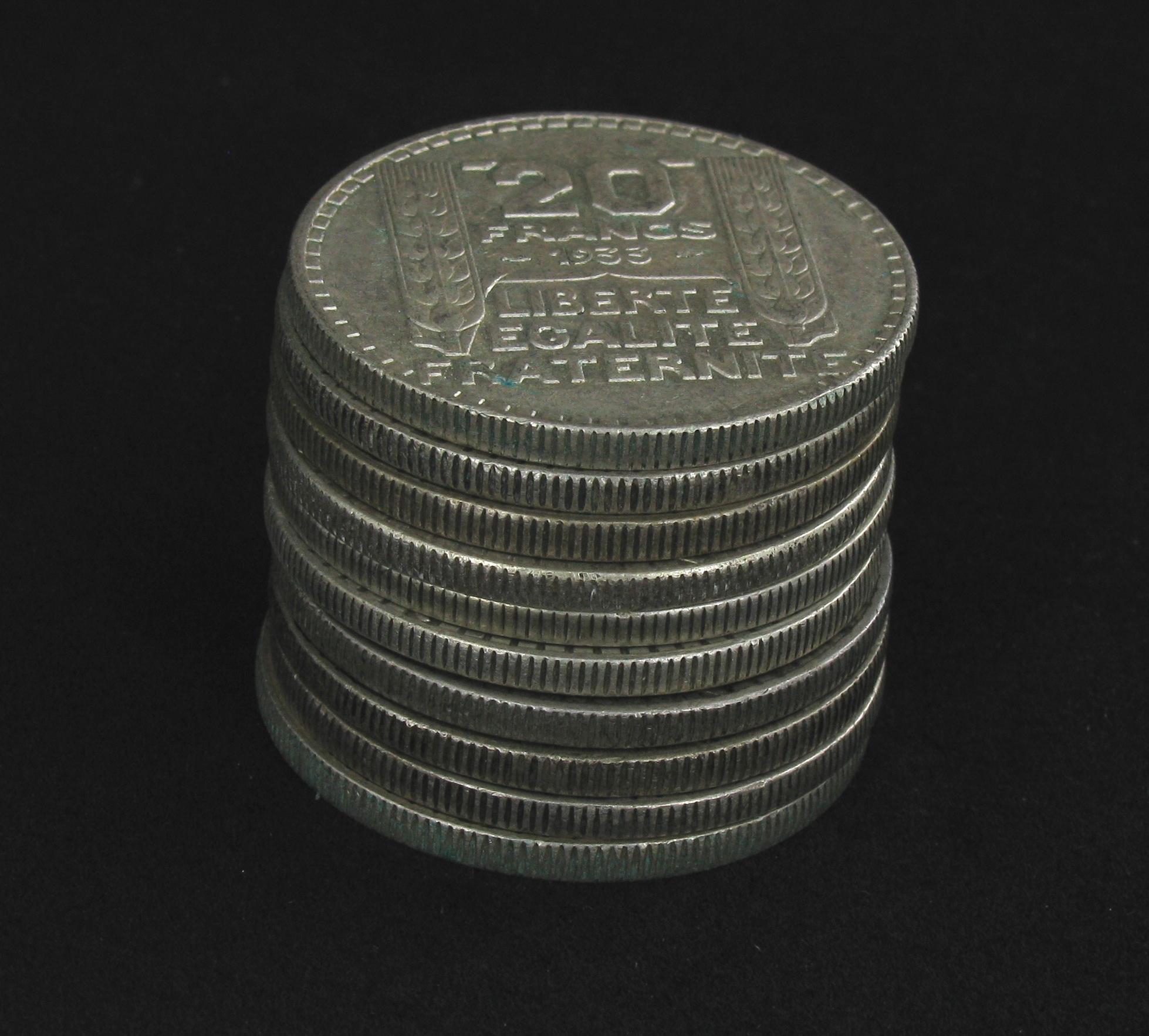 1933 France Silver 20 Francs Unsearched Stack of 10 All AU+/Unc 4.4 Ounces Silver! (COI-5243)