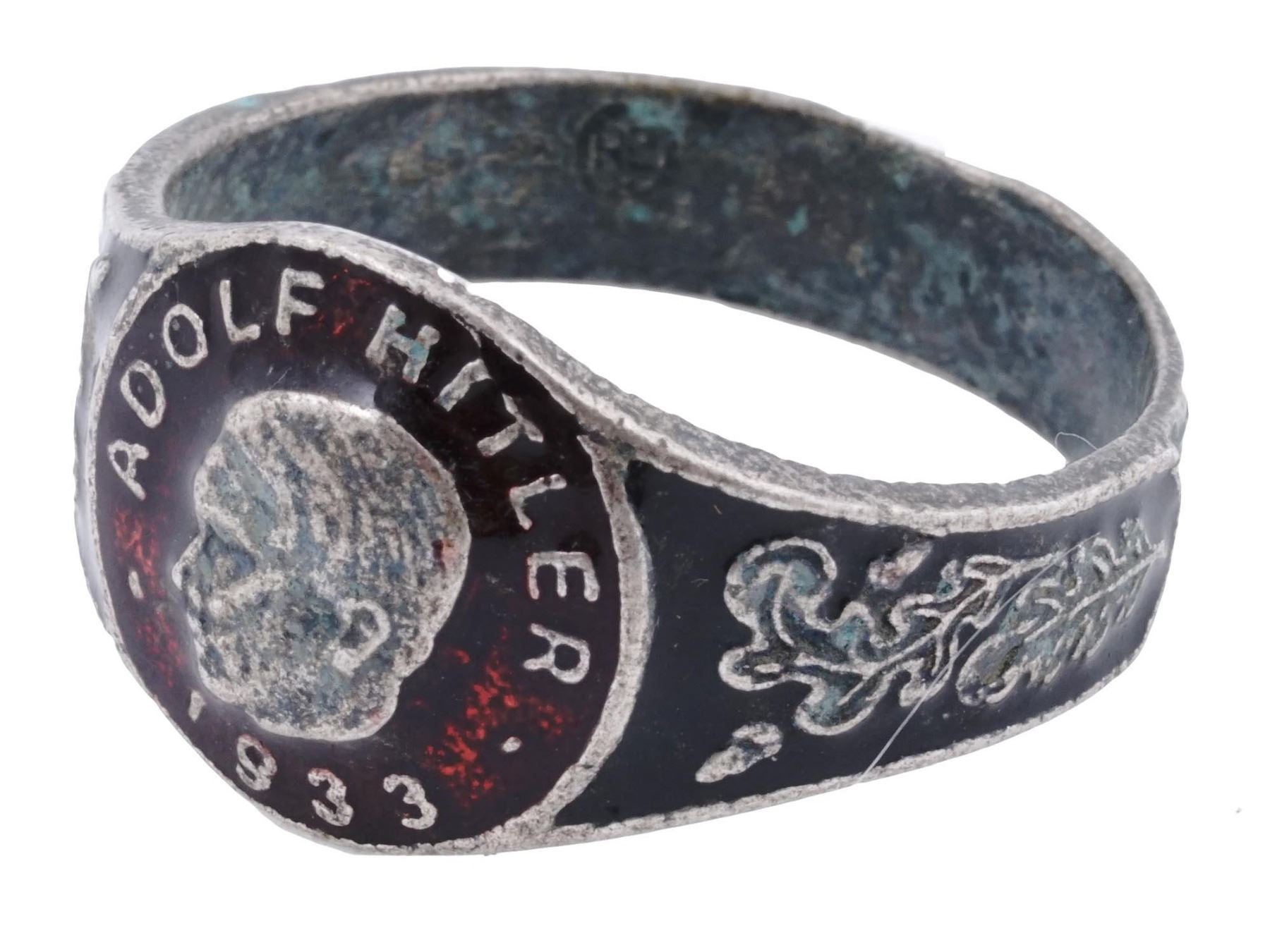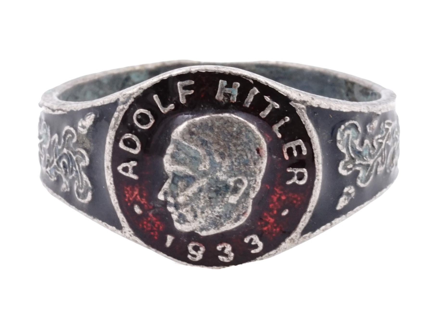 With a portrait of Adolf Hitler, inscribed upper to the centre, dated 1933, lower to the centre, and covered with enamel in a red shade. The ring features an oak leaves pattern, and covered with enamel in a black shade on the side. marked with an 800 Silver hallmark.