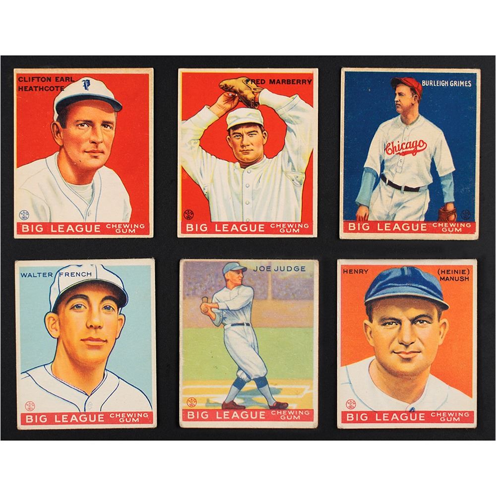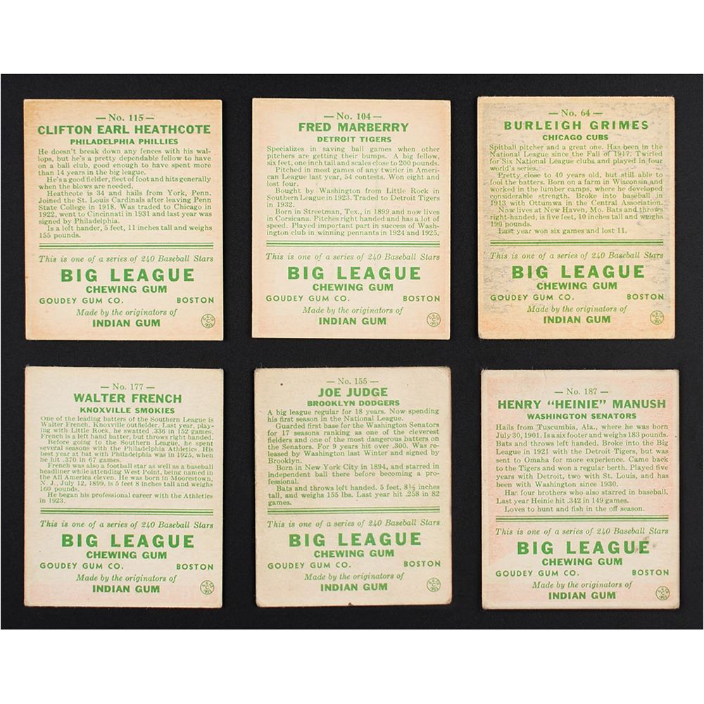 Highly appealing mid-grade lot of (33) 1934 Goudey baseball cards with a handful of semi-stars and Hall of Famers, grading overall at 10% EX, 20% VG-EX, 45% VG, and 25% G. Key cards include #64 Burleigh Grimes (VG), #104 Fred Marberry (EX), #118 Cliff Heathcote (VG-EX), #155 Joe Judge (G), #177 Walter French (VG), and #187 Heinie Manush (VG). Other cards are: #14, 18, 46, 48, 52, 65, 71, 82, 88, 91 (2), 94, 95, 101 (2), 105, 118, 126, 135, 139 (2), 152, 172, 184, 185, 214, and 215.