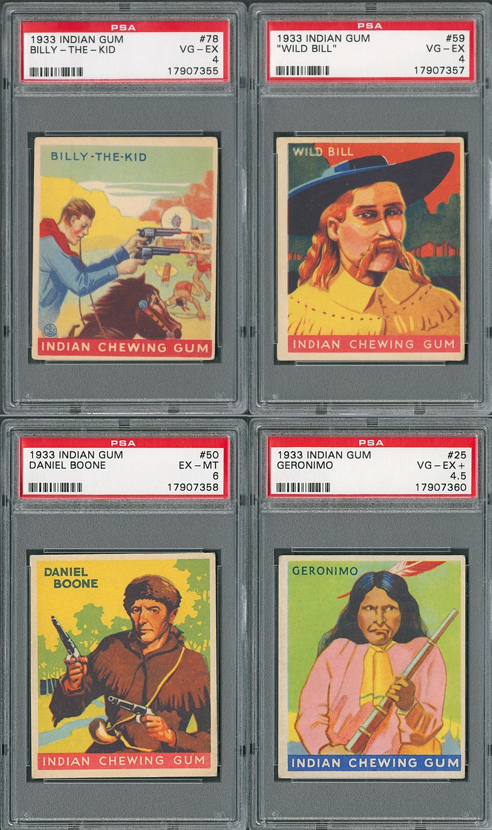 Includes: #1 Shienne Tribe (VG), 25 Geronimo (PSA VG-EX+ 4.5), 33 Pocahontas (VG/EX), 38 Sitting Bull (VG), 50 Daniel Boone (PSA EX-MT 6), 52 Davy Crockett (VG/EX), 55 General Custer (TRIMMED), 56 William Penn (EX/MT), 59 Wild Bill Hickcok (PSA VG-EX 4), 60 Buffalo Bill (PSA GOOD+ 2.5), 70 Captain John Smith (VG/EX), 78 Billy-the-Kid (PSA VG-EX 4), 92 Chief White Cloud (VG/EX), 109 Little White Cloud (VG).