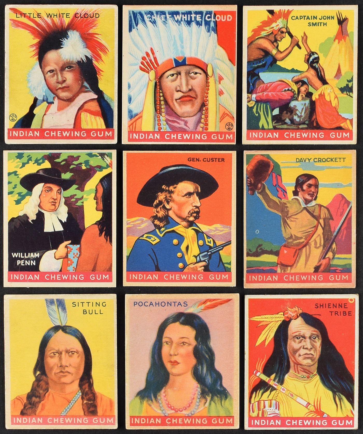 Goudey's Indian Gum set is among the most popular of all non-sports sets. The set contains 216 numbered, multicolored artwork cards highlighting individual Indians, tribes, famous action scenes, and US military leaders of the time.