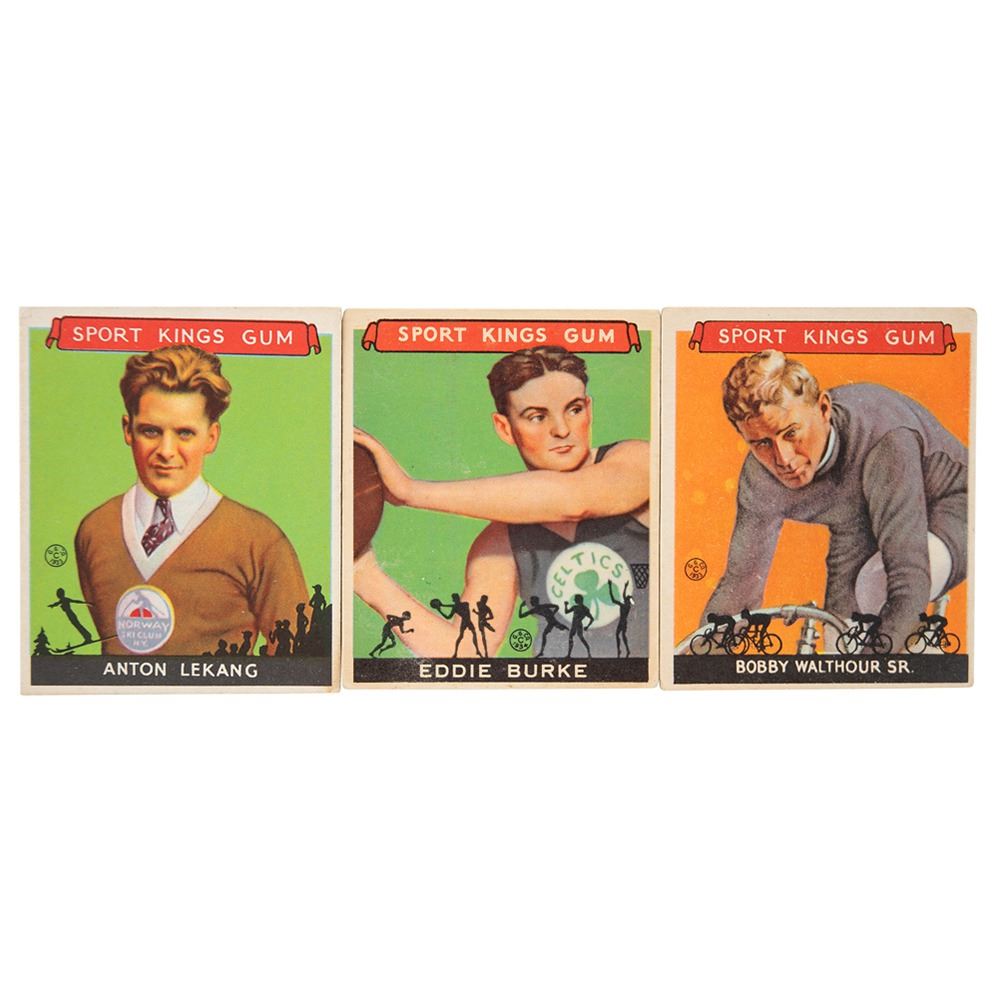 Three ungraded cards from the 1933 Goudey Sport Kings Gum set, including: #7 Bobby Walthour Sr. (VG), #10 Anton Lekang (EX), and #33 Eddie Burke (VG+). A diverse and desirable athletic trio, featuring a cyclist, ski jumper, and basketball player.