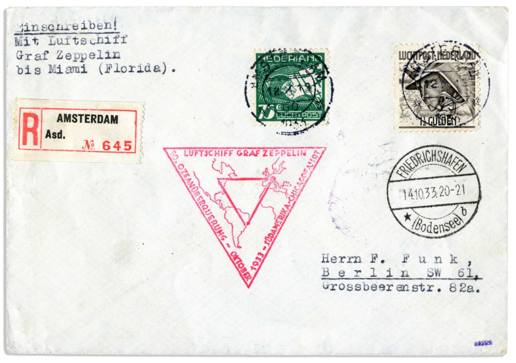 Envelope flown upon the LZ 127 Graf Zeppelin, the German airship that operated from 1928 to 1937. Cover has the 1933 ''Graf Zeppelin'' red stamp, charting the route of the Zeppelin during its famous ''Century of Progress'' flight, commemorating the Century of Progress World's Fair in Chicago. Cover also has several 1933 postmarks from Berlin, Miami and New York. Cover measures 6.25'' x 4.5''. Very good to near fine condition.