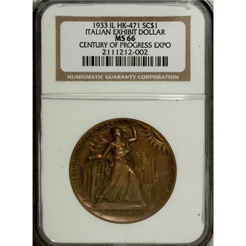 <B>1933 Century of Progress Exposition Italian Exhibit Dollar MS66 NGC.</B></I> HK-471. A superb example of this high relief so-called dollar, listed as very scarce in the so-called dollar reference catalog by Hibler and Kappen.<BR><BR><b>Shipping:</b> Coin/Currency (<a target="_blank" href="http://www.heritageauctions.com/common/shipping.php">view shipping information</a>)