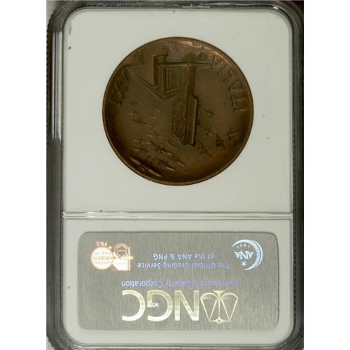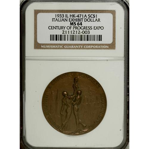 <B>1933 Century of Progress Italian Exhibit Dollar, MS64 NGC.</B></I> HK-471A. Another very high relief so-called dollar issued for the Italian Exhibit, unlisted in the Hibler-Kappen standard reference catalog. This piece follows the same design theme as the one shown in the catalog.<BR><BR><b>Shipping:</b> Coin/Currency (<a target="_blank" href="http://www.heritageauctions.com/common/shipping.php">view shipping information</a>)