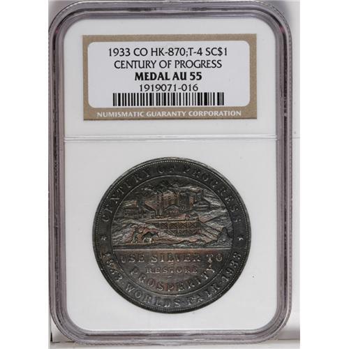 <B>1933 Colorado Century of Progress Type Four Dollar, HK-870, AU55 NGC.</B></I> These aided Colorado's participation in the Chicago Century of Progress Exposition. A richly toned example of this scarce so-called dollar.