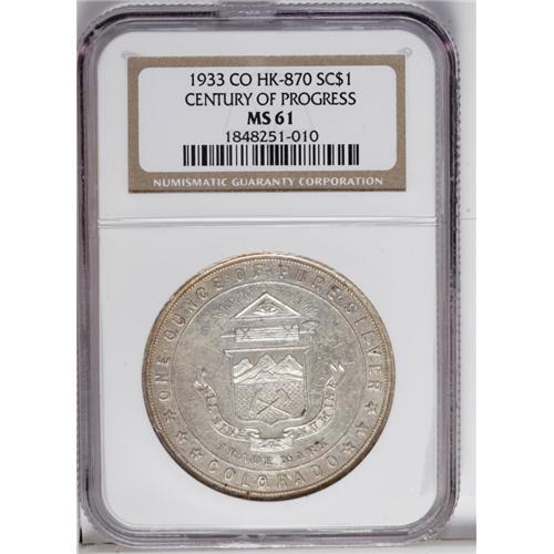 <B>1933 Colorado Century of Progress Type Four Dollar, HK-870, MS61 NGC.</B></I> Issued to help finance the State of Colorado's participation at the Century of Progress Exposition in Chicago. The pieces were struck in Denver by the firm of H.H. Tammen Co. Listed in Hibler-Kappen.