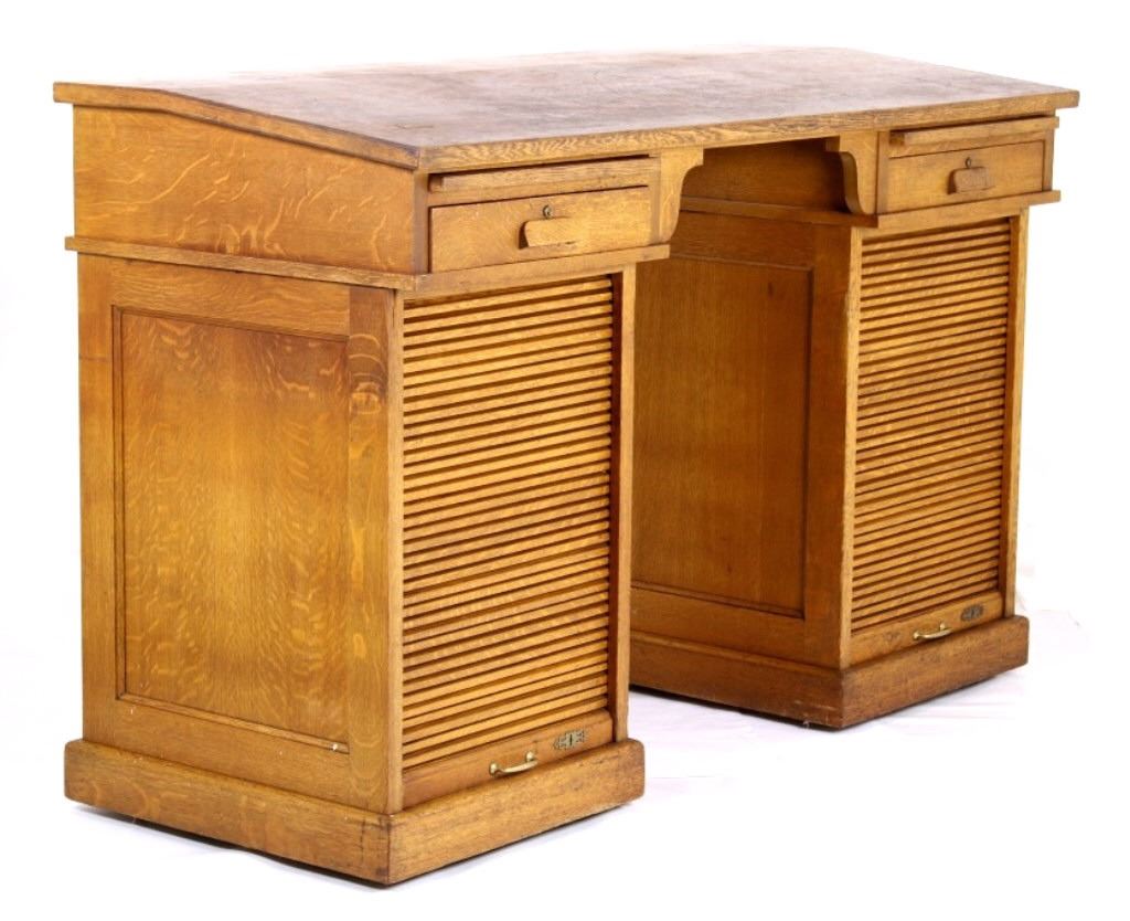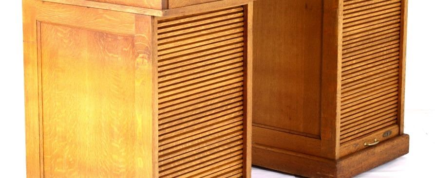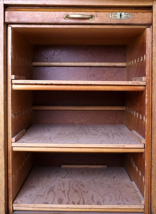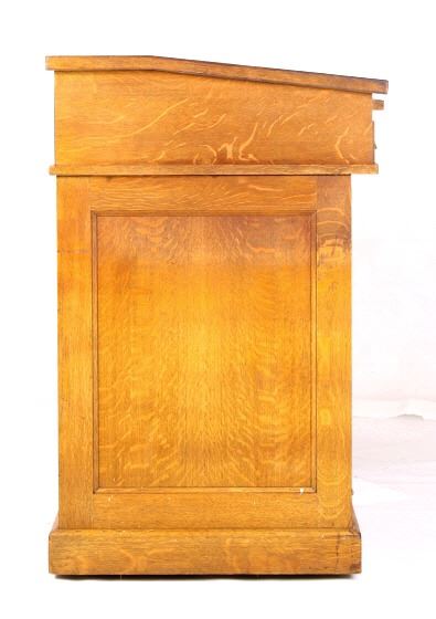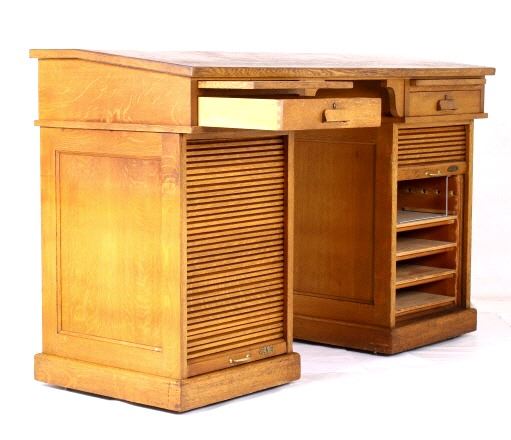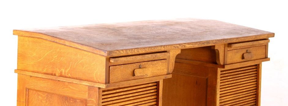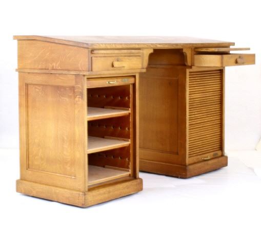 For you bidding pleasure is this 1933 Helena, Mt Tiger Oak Roll Top Drafting Desk. This desk shows fantastic craftsmanship With the pieces crafted from quarter sawn oak and snug joints that make up the foundation for this work space essential. The pedestals are built with roll top curtains that can be pulled up to reveal placements with flat boards meant for organizing work, that can be pulled out and retracted. The lumber that this desk is made from came out of Helena, Montana in 1933 by Morgan LBR. & MFG. CO. as presented by the stamp under many of the drawers. Also the drafting table top is crafted solidly with a beveled top built specifically for standing work or from an elevated chair. The keys are for the two top drawers and they unlock the roll top curtain as well there are three keys to this desk. The measurements of this desk are 45" x 29" x 71".