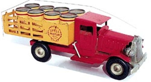 Has rubber wheels, working headlights, 12" long. Also has the egg shell canisters in the bed of the truck. Very nice overall. Avg. wear a few paint chips and nicks. Fairly good paint remains. Cond. 7.0-7.5.