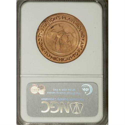 <B>1933 Michigan Dollar, HK-473, MS66 Red NGC.</B></I> Gilt, reddish, 33.3 mm. Struck by the State of Michigan for distribution at the 1933 Century of Progress Exposition in Chicago, this token is practically an advertising card. The reverse legend reads THE NATIONS PLAYGROUND, COME TO MICHIGAN TO PLAY. Considering the proximity of Michigan to Chicago, such an advertisement was appropriate and wise. This piece is of the highest quality. Radiant luster shines through fully mint-red coloration. One of the finest certified for the type. Census: 4 in 66, 0 finer (8/07).<BR><BR><b>Shipping:</b> Coins & Currency (<a target="_blank" href="http://www.heritageauctions.com/common/shipping.php">view shipping information</a>)