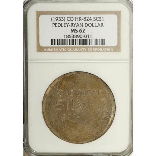 (1933) Pedley-Ryan Dollar MS62 NGC. HK-824. Dappled ora