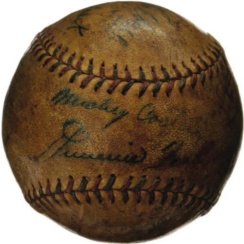 <B>1933 Philadelphia Athletics Team Signed Baseball.</B></I> The strong sweet spot pairing of twin Hall of Famers Jimmie Foxx and Mickey Cochrane make this OAL (Harridge) ball a hot commodity, particularly for collectors of the great Athletics dynasty of the era. Though the glory days of 1929-31 were behind them, the white elephants still held onto some remnants of their past greatness, and we also find a light (3/10) Lefty Grove on one of the side panels. Ten autographs are still discernible on this deeply shellacked sphere, but again it's Jimmie and Mickey that will draw the interest here, with all but the final letters of Cochrane's surname projecting at a strength of 7/10 or better. <I>LOA from PSA/DNA. LOA from James Spence Authentication.</B></I><BR><BR><b>Shipping:</b> Balls, Pucks, etc., Small (<a target="_blank" href="http://www.heritageauctions.com/common/shipping.php">view shipping information</a>)
