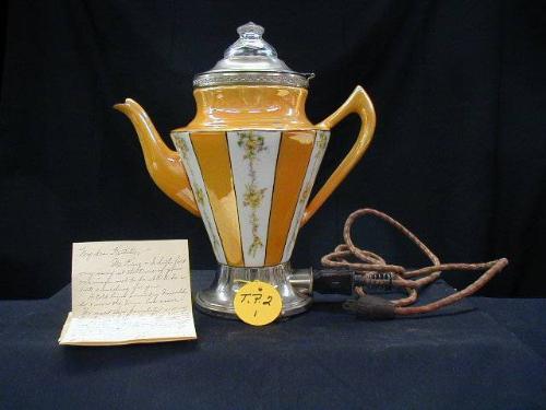 1933 ROYAL ROCHESTER LUSTREWARE PORC. COFFEE POT COMPLETE W/ORIGINAL HND WRITTEN WEDDING PRESENT NOTE EXCELLENT