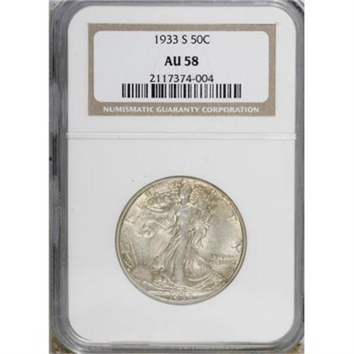 <B>1933-S 50C AU58 NGC.</B></I> NGC Census: (118/436). PCGS Population (122/800). Mintage: 1,786,000. Numismedia Wsl. Price for NGC/PCGS coin in AU58: $350. (#6591)<BR><BR><B>Coin Engraver:</B> Adolph A. Weinman<BR><BR><b>Shipping:</b> Coins & Currency (<a target="_blank" href="http://www.heritageauctions.com/common/shipping.php">view shipping information</a>)