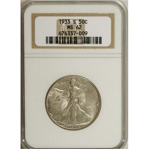 <B>1933-S 50C MS62 NGC.</B></I> The 1933-S Walker, the first such issue of half dollars in four years, offers a convenient demarcation between the more challenging pieces from earlier years and the comparatively easier later coins. This boldly impressed example has a lovely satiny appearance and thin violet and tan patina over both sides.<BR><BR><B>Coin Engraver:</B> Adolph A. Weinman<BR><BR><b>Shipping:</b> Coins & Currency (<a target="_blank" href="http://www.heritageauctions.com/common/shipping.php">view shipping information</a>)