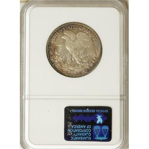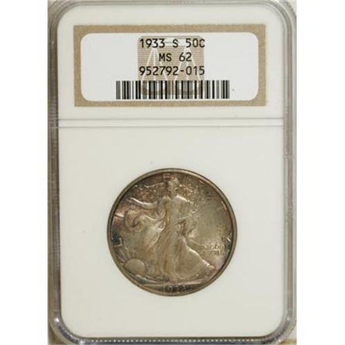 <B>1933-S 50C MS62 NGC.</B></I> Ivory, lilac, gold, and iridescent toning graces both sides of this boldly defined Mint State piece. The date is the final year of the early series prior to the increased production that began in 1934.<BR><BR><B>Coin Engraver:</B> Adolph A. Weinman<BR><BR><b>Shipping:</b> Coins & Currency (<a target="_blank" href="http://www.heritageauctions.com/common/shipping.php">view shipping information</a>)