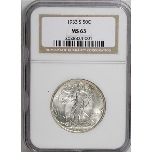 <B>1933-S<50C> MS63 NGC.</B></I> This issue is elusive in Select grades and above. This is a well struck piece with quality luster and the palest of toning, though small abrasions help define the grade.