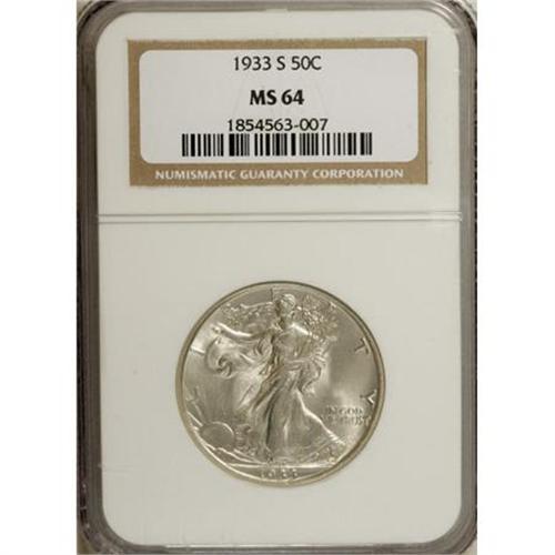 <B>1933-S 50C MS64 NGC.</B></I> After a four-year hiatus for the denomination, half dollar production began again, though not at Philadelphia. San Francisco coined just under 1.8 million business strikes for this often-elusive issue. The present piece, strongly lustrous and solidly struck with a touch of satin, has a hint of rose patina against the silver-gray of the fields.<BR><BR><B>Coin Engraver:</B> Adolph A. Weinman<BR><BR><b>Shipping:</b> Coins & Currency (<a target="_blank" href="http://www.heritageauctions.com/common/shipping.php">view shipping information</a>\)