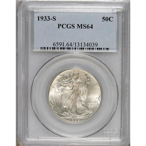 <B>1933-S 50C MS64 PCGS.</B></I> This is a scarce low-mintage issue, and the example offered here is an exceptional representative of the date with brilliant silver luster and sharp design details. The skirt lines, thumb, head, and eagle's breast are all sharply defined.<BR><BR><b>Shipping:</b> Coins & Currency (<a target="_blank" href="http://www.heritageauctions.com/common/shipping.php">view shipping information</a>)