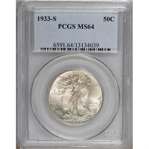 <B>1933-S 50C MS64 PCGS.</B></I> This is an elusive, low-mintage issue, and the example offered here is an exceptional representative of the date, boldly detailed and brilliant. The skirt lines, thumb, head, and eagle's breast are all sharply defined.<BR><BR><B>Coin Engraver:</B> Adolph A. Weinman<BR><BR><b>Shipping:</b> Coins & Currency (<a target="_blank" href="http://www.heritageauctions.com/common/shipping.php">view shipping information</a>\)