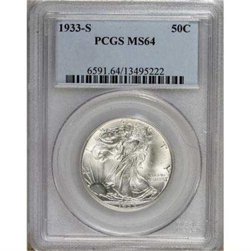 <B>1933-S 50C MS64 PCGS.</B></I> The brilliant white surfaces display a lovely satiny sheen across both sides. The design elements are boldly rendered, and even Liberty's branch hand shows a fully separated thumb. The reverse is remarkably clean, while the obverse has a few wispy slide marks. <BR><BR><B>Coin Engraver:</B> Adolph A. Weinman<BR><BR><b>Shipping:</b> Coins & Currency (<a target="_blank" href="http://www.heritageauctions.com/common/shipping.php">view shipping information</a>)