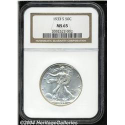 <B>1933-S<50C> MS65 NGC.</B></I> Untoned with a hard, satiny brilliance and expectantly bold central devices. Myriad fine die polishing lines in the fields suggest that this Depression-era Gem was struck from a very early state of the dies. <BR><BR><B>Important notice:</B> Heritage usually auctions material at the rate of 200-250 lots per hour. On some occasions eBay Live bid software or the Internet may not be able to keep up with the pace of the auction. We recommend placing a realistic absentee bid now as insurance to avoid disappointment. Occasionally the auctioneer may eliminate or reject an eBay Live bid, and the auctioneer may also reopen a lot after the close of the eBay live bidding (usually because we missed an audience bid), and may reject your bid even if it shows you as the winning bidder. By bidding via eBay Live, you agree that Heritage may award the lot to another bidder at its sole discretion under the circumstances described above or any other reasonable circumstances. Since eBay bids are not shown to us until we open the lot on the floor, we treat those bids just like floor bids. In most cases the floor responds before the eBay bid is presented to us, due to Internet lag time, so for consistency we have made it a policy that floor bids are always considered first over tie eBay live bids. Also please note that all Heritage lots purchased through eBay Live carry a 20% Buyer's Premium. Please make sure you read the Terms and Conditions before you bid.