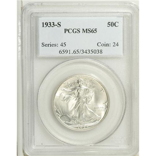 <B>1933-S 50C MS65 PCGS.</B></I> The 1933-S is a perennially popular half dollar, the last issue among the early dates in the Walking Liberty series. At least one monomaniacal collector is known to buy <I>only</B></I> examples of this date at coin shows, at the expense of all other U.S. coin issues. It is also one of the few early dates that can be found with strong striking details. This sharply defined example has a split thumb, and is brilliant and highly lustrous. Perhaps the most attractive feature, though, is the smooth, unblemished hip area on Liberty. A few tiny contact marks can be found in the right obverse field, but overall, this coin has the appearance of an even higher grade.<BR><BR><b>Shipping:</b> Coin/Currency (<a target="_blank" href="http://www.heritageauctions.com/common/shipping.php">view shipping information</a>)