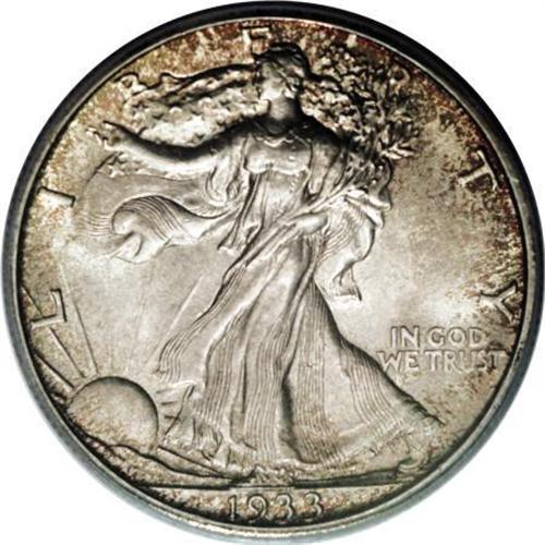 <B>1933-S 50C MS65 PCGS.</B></I> Dappled golden-brown and sea-green toning ensures the eye appeal of this lustrous Gem. The strike is precise throughout, and both sides are beautifully preserved. The San Francisco mint struck only Walking Liberty half dollars in 1933, since the Great Depression limited demand for coinage.<BR><BR><B>Coin Engraver:</B> Adolph A. Weinman<BR><BR><b>Shipping:</b> Coins & Currency (<a target="_blank" href="http://www.heritageauctions.com/common/shipping.php">view shipping information</a>\)