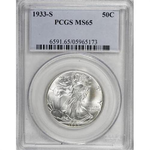 <B>1933-S 50C MS65 PCGS.</B></I> Beautifully effulgent mint luster radiates from each side of this lovely, snow-white Gem. Both sides are minimally marked, as expected for the grade, and the striking details are typically bold. A faint splash of gold color occupies the right obverse field.<BR><BR><B>Coin Engraver:</B> Adolph A. Weinman<BR><BR><b>Shipping:</b> Coins & Currency (<a target="_blank" href="http://www.heritageauctions.com/common/shipping.php">view shipping information</a>)