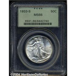 <B>1933-S<50C> MS66 PCGS.</B></I> Fully struck with remarkably clean surfaces, and showing virtually no toning on either side. A very sharp, upper-end example of this scarce issue. Population: 70 in 66, 6 finer (7/04).<BR><I>From The Dr. Frank Lanza Collection of Walking Liberty Half Dollars.</B></I> <BR><BR><B>Important notice:</B> Heritage usually auctions material at the rate of 200-250 lots per hour. On some occasions eBay Live bid software or the Internet may not be able to keep up with the pace of the auction. We recommend placing a realistic absentee bid now as insurance to avoid disappointment. Occasionally the auctioneer may eliminate or reject an eBay Live bid, and the auctioneer may also reopen a lot after the close of the eBay live bidding (usually because we missed an audience bid), and may reject your bid even if it shows you as the winning bidder. By bidding via eBay Live, you agree that Heritage may award the lot to another bidder at its sole discretion under the circumstances described above or any other reasonable circumstances. Since eBay bids are not shown to us until we open the lot on the floor, we treat those bids just like floor bids. In most cases the floor responds before the eBay bid is presented to us, due to Internet lag time, so for consistency we have made it a policy that floor bids are always considered first over tie eBay live bids. Also please note that all Heritage lots purchased through eBay Live carry a 20% Buyer's Premium. Please make sure you read the Terms and Conditions before you bid. </span></font></tr></table></td></tr></table>
