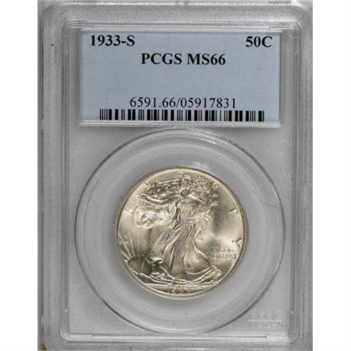 <B>1933-S 50C MS66 PCGS.</B></I> An amazing example that is fully detailed and highly lustrous with brilliant silver surfaces. Although the 1933-S is an exception to the usual rule of weakly defined San Francisco Mint issues, this Premium Gem is even sharper than most that are seen. Population: 74 in 66, 7 finer (8/07).<BR><BR><B>Coin Engraver:</B> Adolph A. Weinman<BR><BR><b>Shipping:</b> Coins & Currency (<a target="_blank" href="http://www.heritageauctions.com/common/shipping.php">view shipping information</a>)