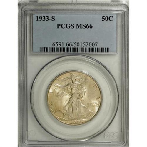 <B>1933-S 50C MS66 PCGS.</B></I> Circulated 1933-S half dollars are plentiful, and even Mint State coins through MS65 can be located with patience and searching. The certified population data show a drop in numbers between MS65 and MS66 pieces. Light golden-champagne color bathes the lustrous surfaces of this Premium Gem, and the design features are well brought up. A few minor obverse marks are consistent with the grade level. Population: 74 in 66, 7 finer (8/07).<BR><BR><B>Coin Engraver:</B> Adolph A. Weinman<BR><BR><b>Shipping:</b> Coins & Currency (<a target="_blank" href="http://www.heritageauctions.com/common/shipping.php">view shipping information</a>)
