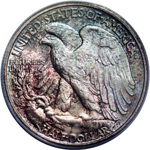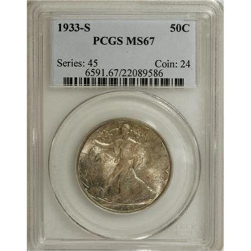 <B>1933-S 50C MS67 PCGS.</B></I> Variegated ocean-blue and golden-brown shades endow this lustrous and exactingly struck Superb Gem. The skirt lines and branch hand are exceptionally sharp for a Walking Liberty half, particularly one from the San Francisco Mint. Careful rotation beneath a light locates only a couple of minute marks that do not betray the MS67 designation.<BR> The 1933-S is a scarce issue in any Mint State grade, and is seldom encountered above the MS65 level. Many collectors of the day could not afford to set aside a half dollar during this Depression year, and others instead concentrated on keeping up with the many commemorative half dollar issues. Population: 7 in 67, 0 finer (6/07).<BR><BR><B>Coin Engraver:</B> Adolph A. Weinman<BR><BR><b>Shipping:</b> Coins & Currency (<a target="_blank" href="http://www.heritageauctions.com/common/shipping.php">view shipping information</a>\)