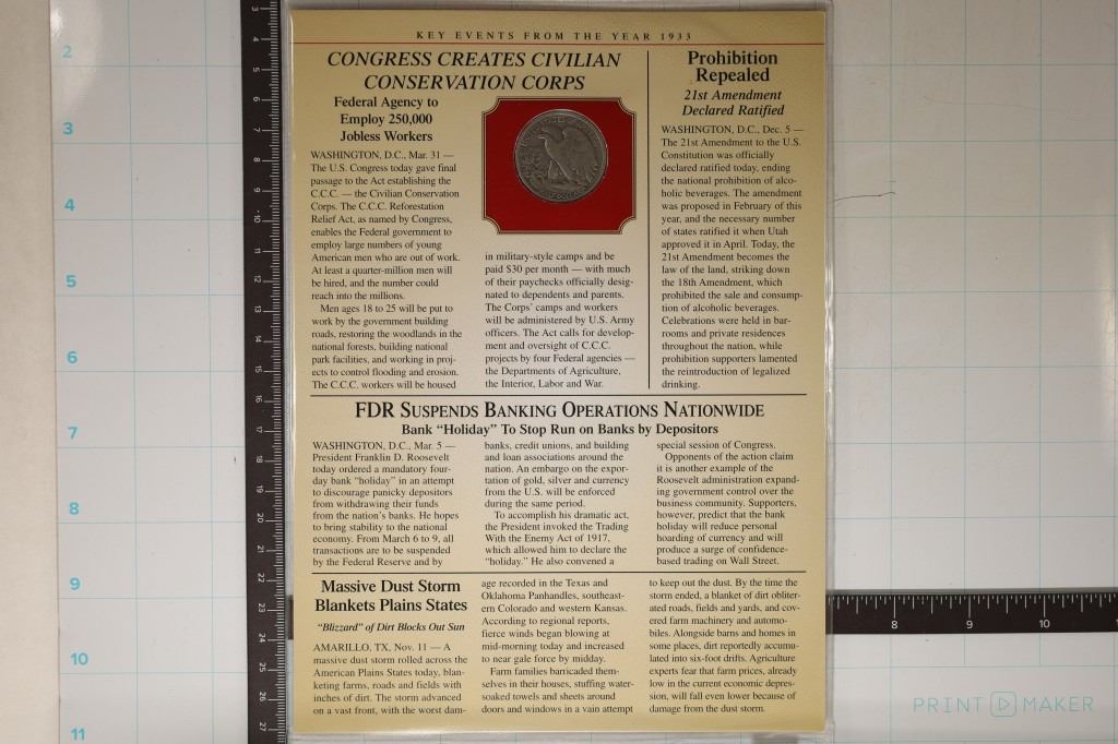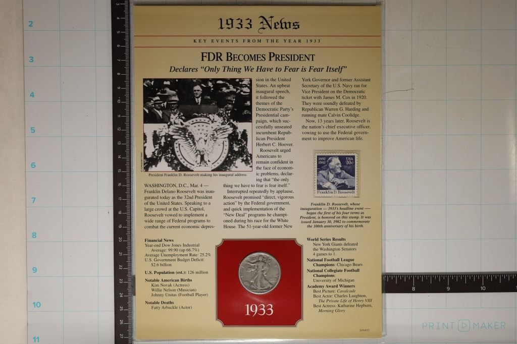 20 CENT STAMP ON NICE INFO CARD ABOUT FDR BECOMING PRESIDENT ALL IN A PLASTIC OUTER SHEET
