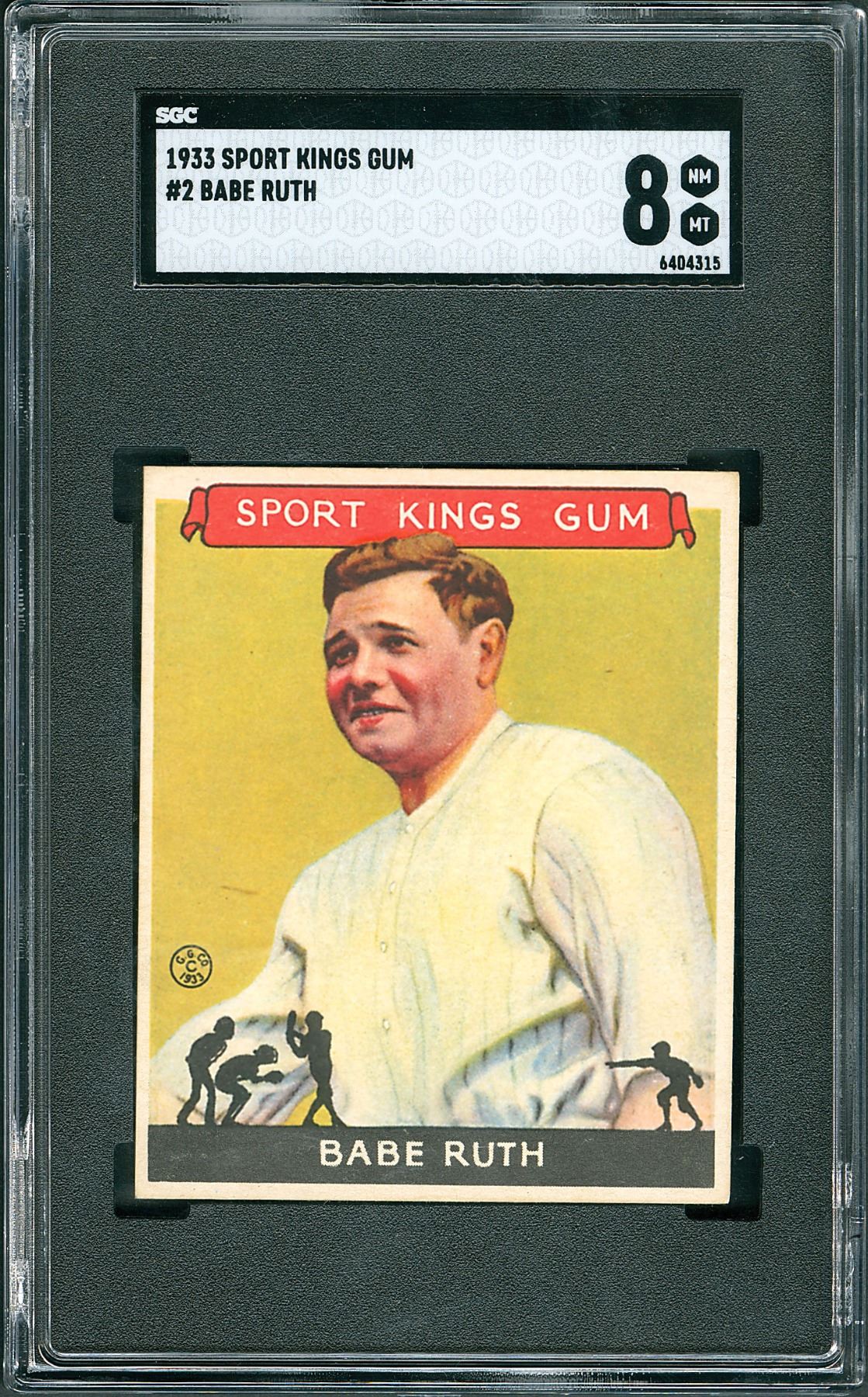 Graded by SGC NM/MT 8. In a sport card set known as "Sport Kings" there would be no better representative than Babe Ruth. The Ruth within the 1933 Sport Kings set is clearly the most popular card, with this offered specimen one of the top graded examples. Slightly off center to the left, the card boasts three sharp corners, with a light touch to the lower left. Bright and fresh in appearance, the bold color accentuates the tight registration of the image.
