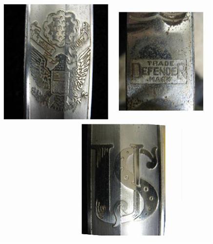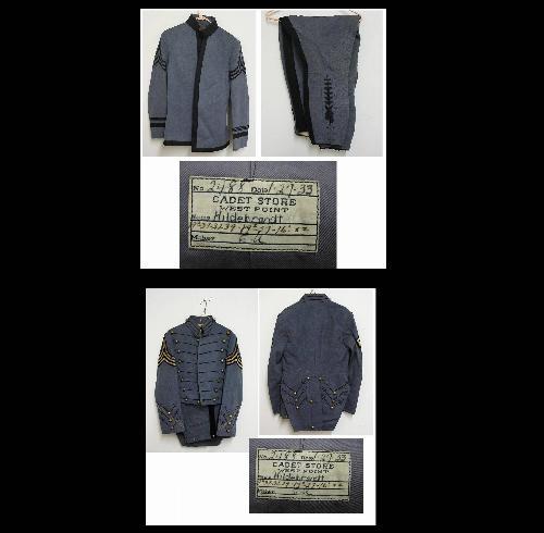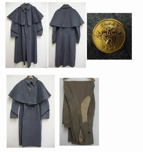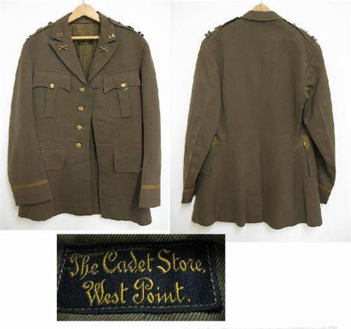 1933 West Point military uniforms and accessories in foot locker including pair of white pants with brass buttons; six white belts with one brass buckle; two white belt sashes with one brass buckle; six white collar and cuffs; dress parade hat with cover; two pouches containing sash buckel and brass belt buckle; officer's style hat; two white dress shirts with brass buttons (one with brass U.S. collar pins and epaulet pins both dated 2-11-32); armless wool knit jersey; dress sword and scabbard (sword stamped trademark Defender; engraved U.S. on one side and with Army seal on other side); white waist belt; two khaki pants (one straight leg and one riding britches); one dress waist jacket with pants with brass buttons and gold chevrons; one under dress jacket with riding britches with black chevrons; two full length overcoats with brass buttons; two 3' x 3' olive drab cloths with tie strings; office olive drab dress jacket with two crossed cannon lapel pins and two U.S. brass lapel pins; captain's bars on shoul