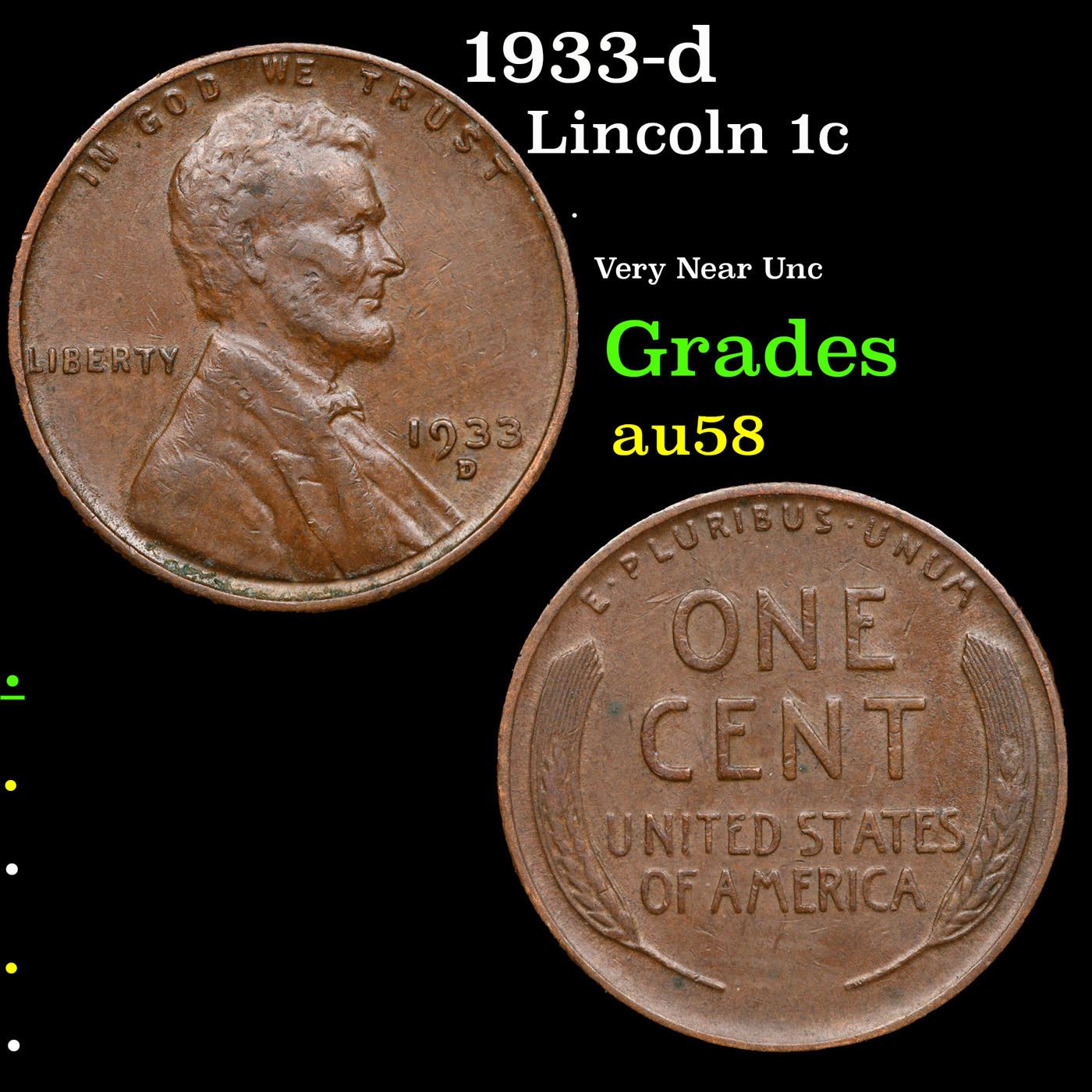 1933-d Lincoln Cent 1c Grades Choice AU/BU Slider.