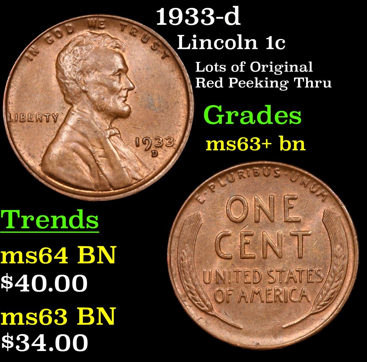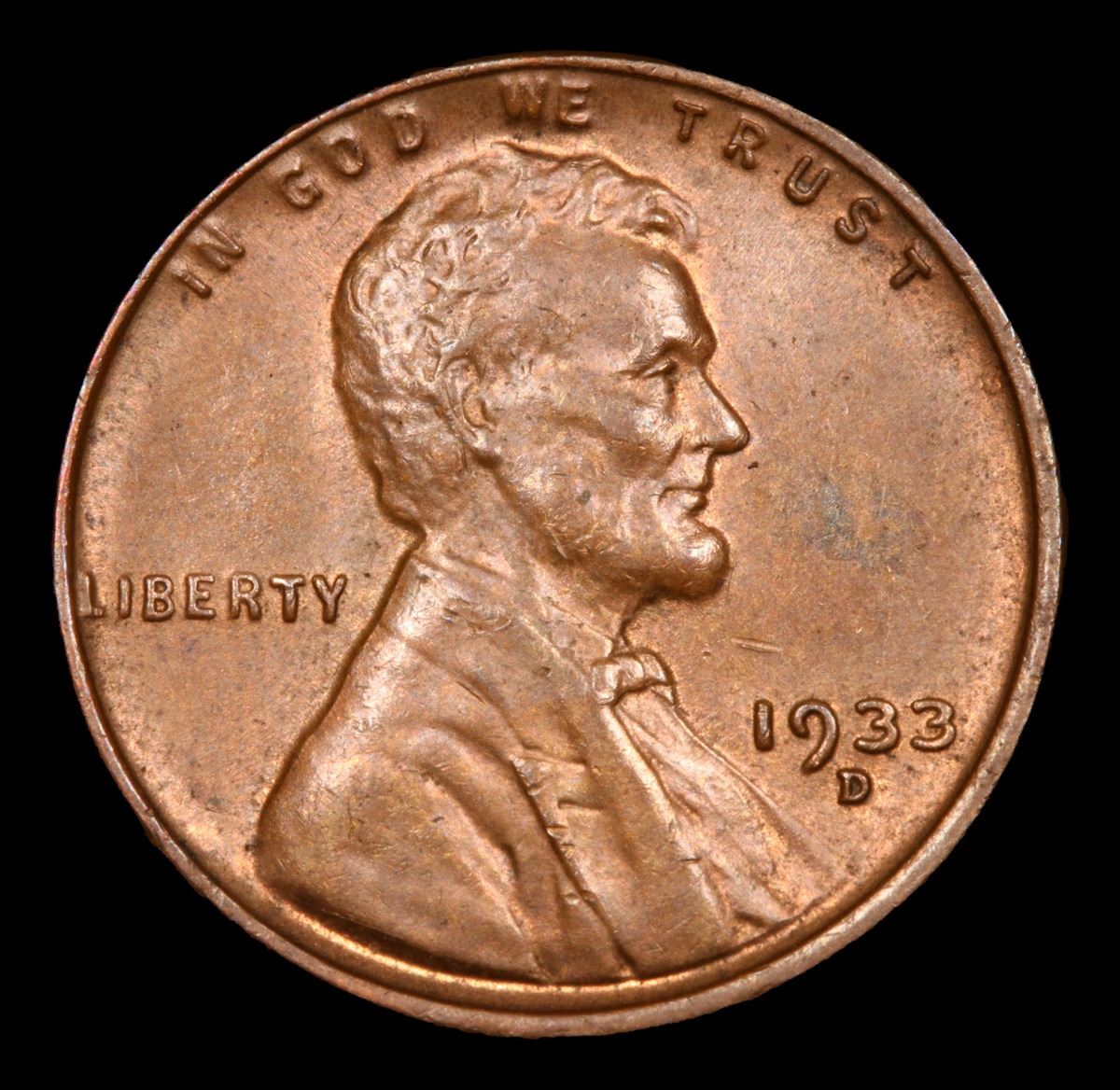 1933-d Lots of Original Red Peeking Thru . Lincoln Cent 1c Grades Select+ Unc BN.