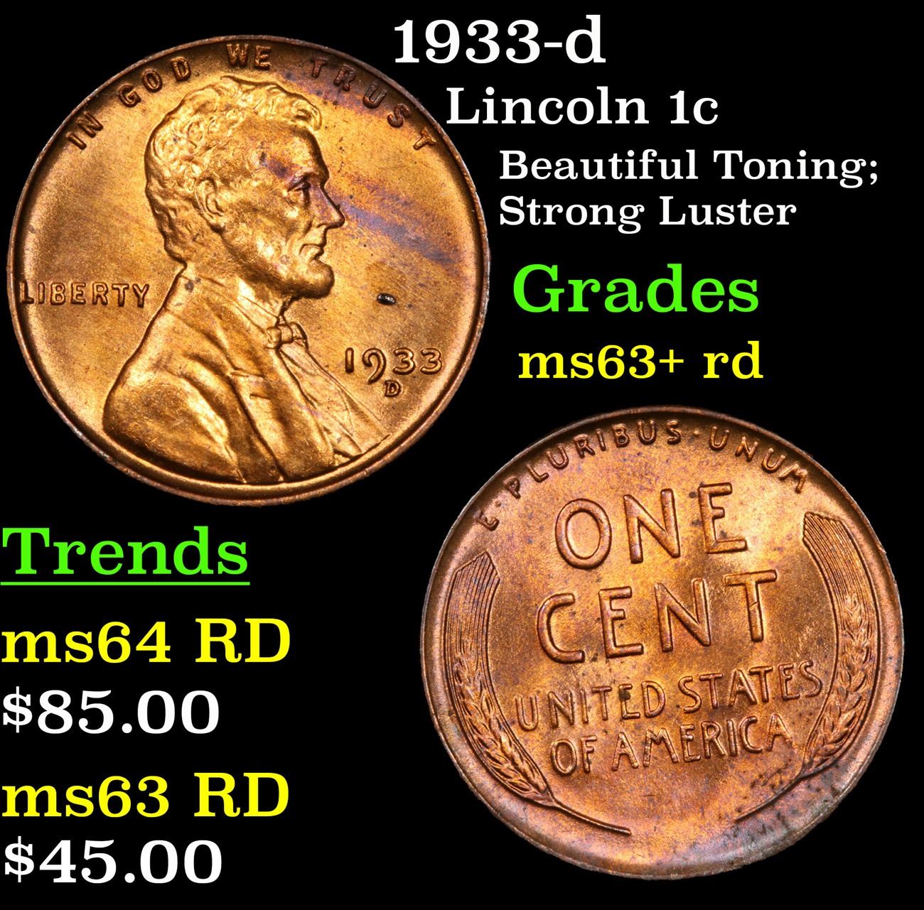 1933-d Beautiful Toning; Strong Luster . Lincoln Cent 1c Grades Select+ Unc RD.