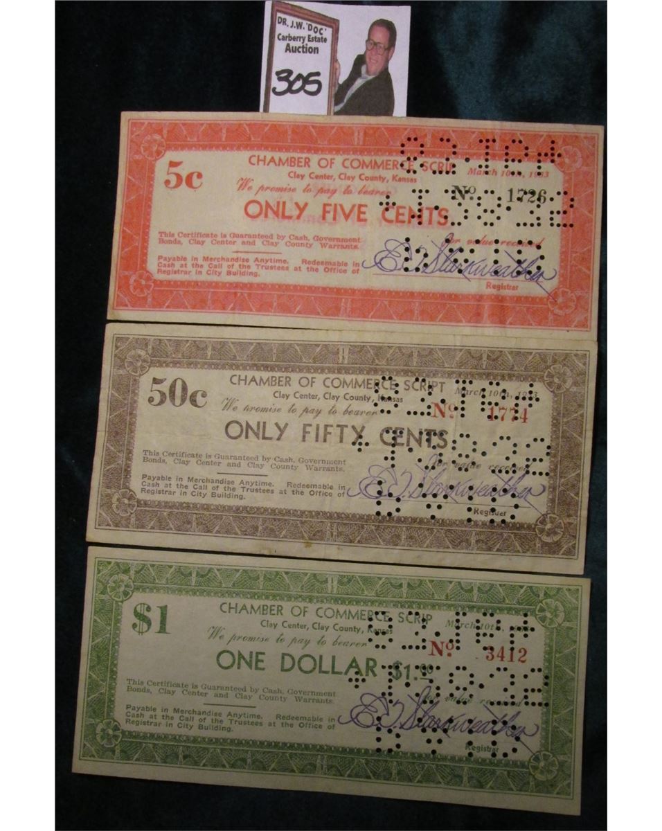 1933 era Depression Scrip "Chamber of Commerce Script Clay Center, Clay County, Kansas" 5c, 50c, & $1.00. Both hole canceled. KS80-.05.b, KS80-.50.b, KS80-1.B.b