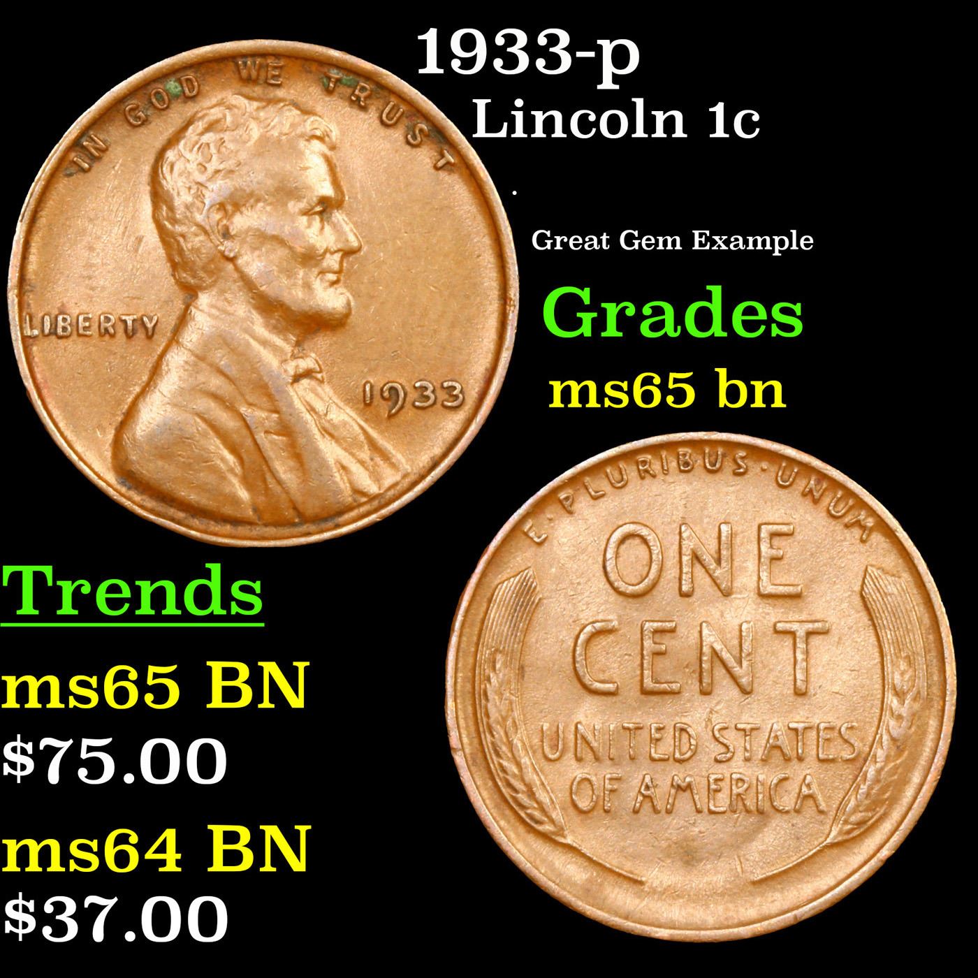 1933-p Lincoln Cent 1c Grades GEM Unc BN.