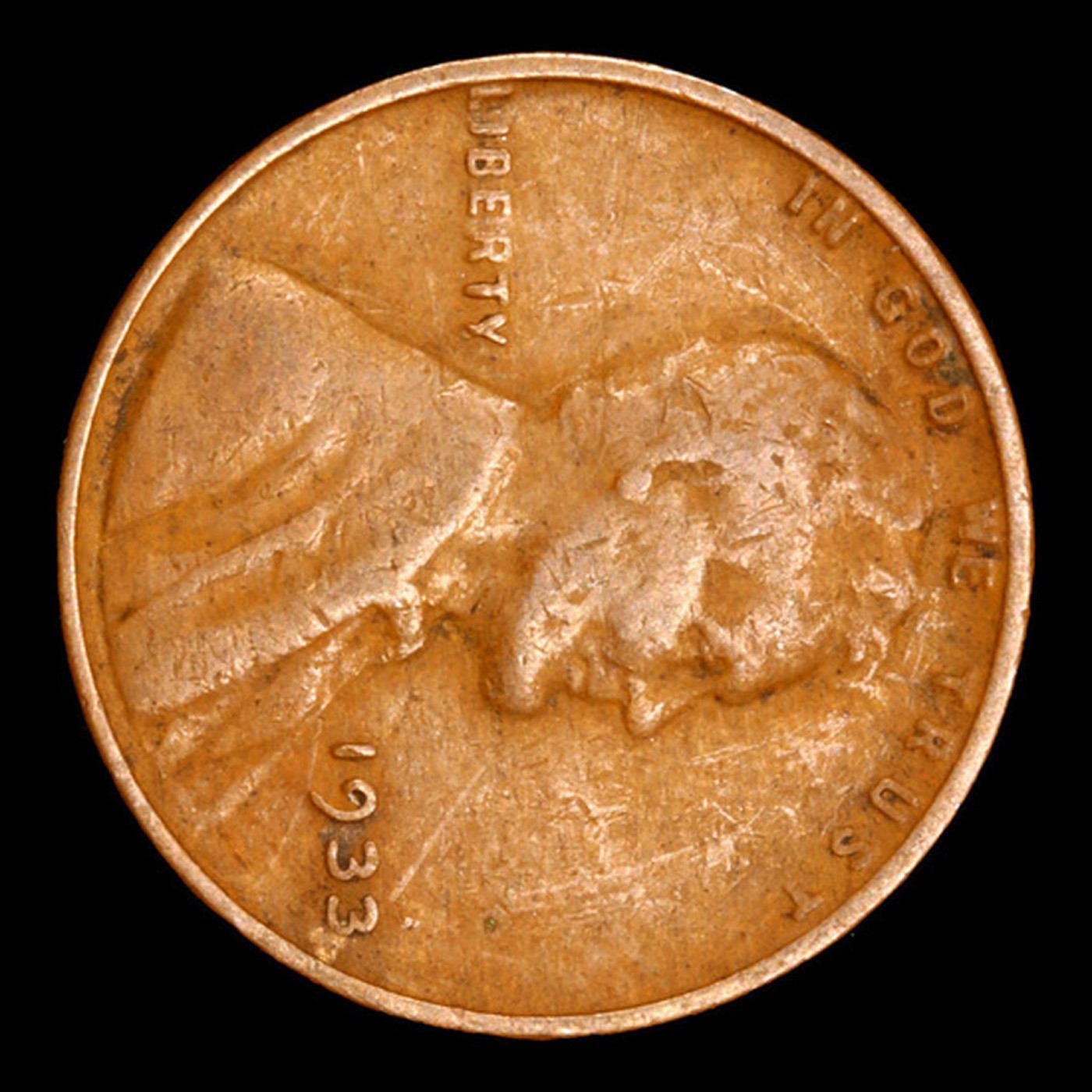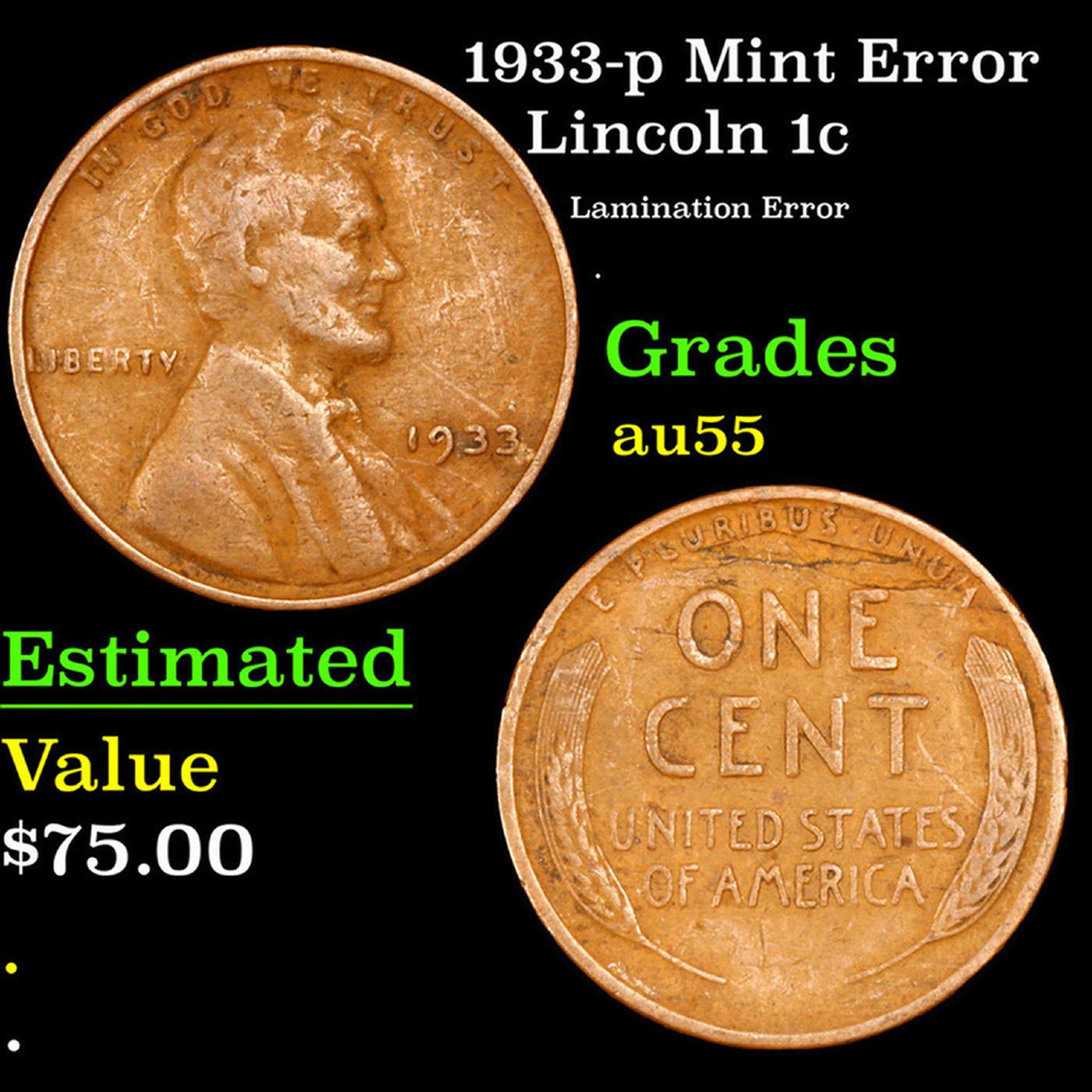 1933-p Mint Error Lincoln Cent 1c Grades Choice AU.