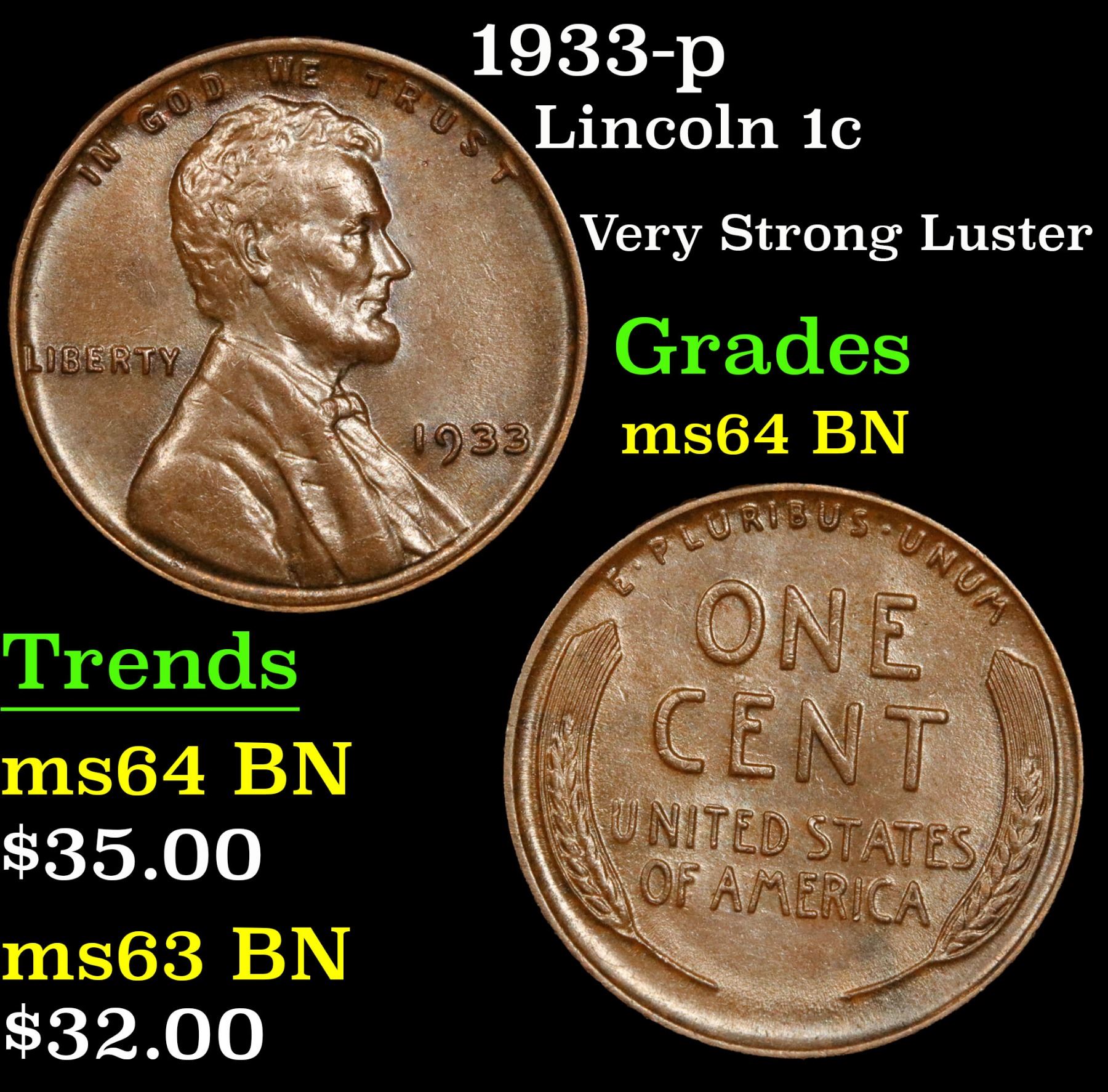 1933-p Very Strong Luster . Lincoln Cent 1c Grades Choice Unc BN.