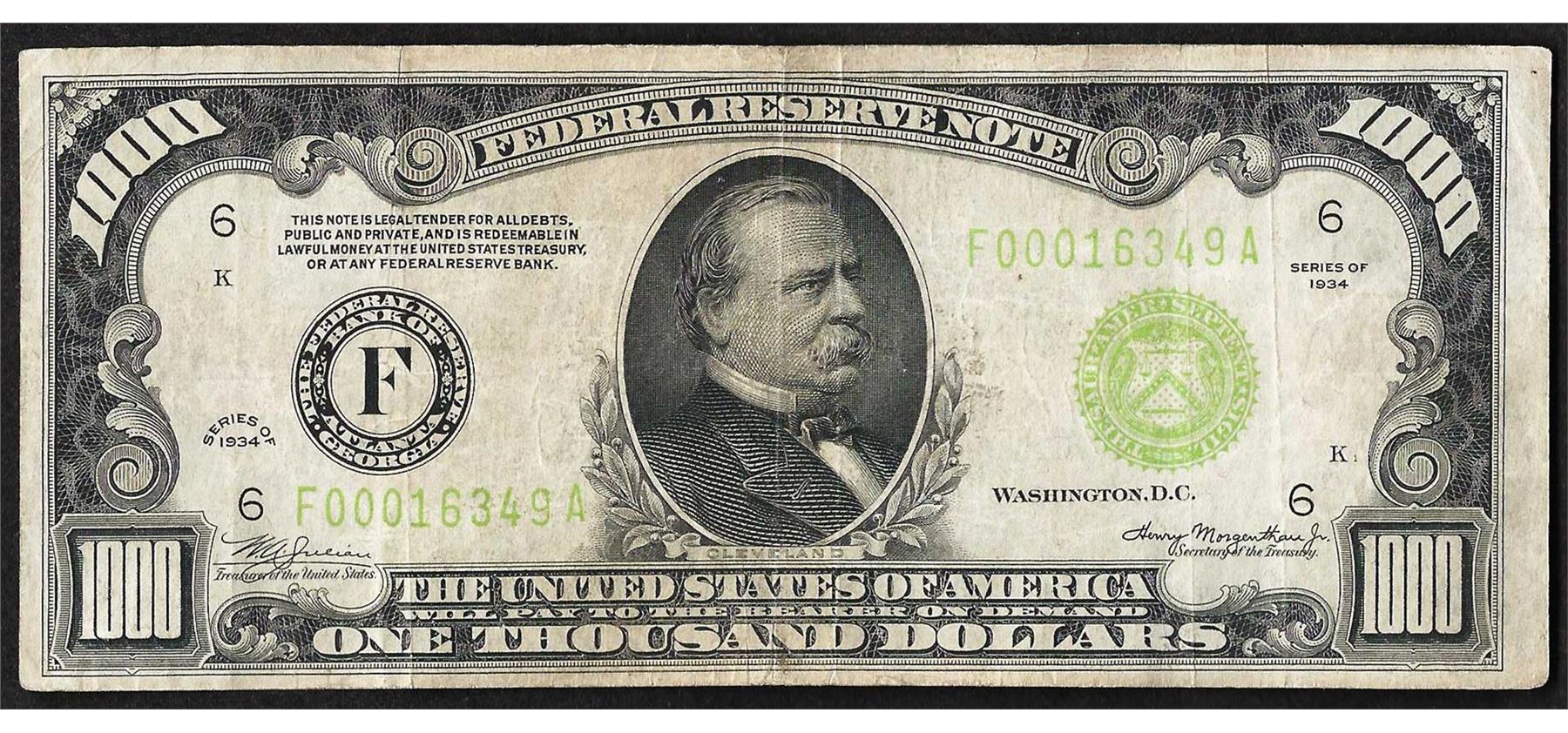 One 1934 $1,000 Federal Reserve Note Atlanta Light Green Seal.