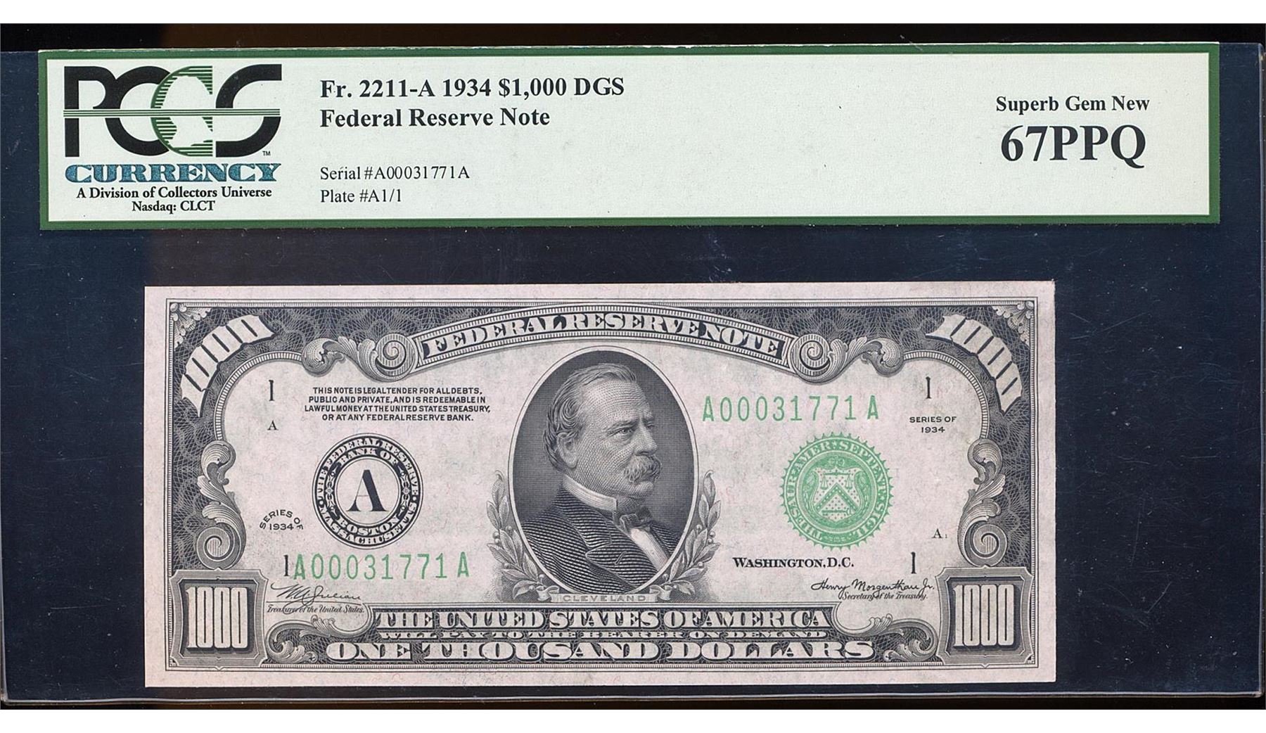 1934 $1,000 Federal Reserve Note Boston Fr.2211-A PCGS Superb Gem New 67PPQ